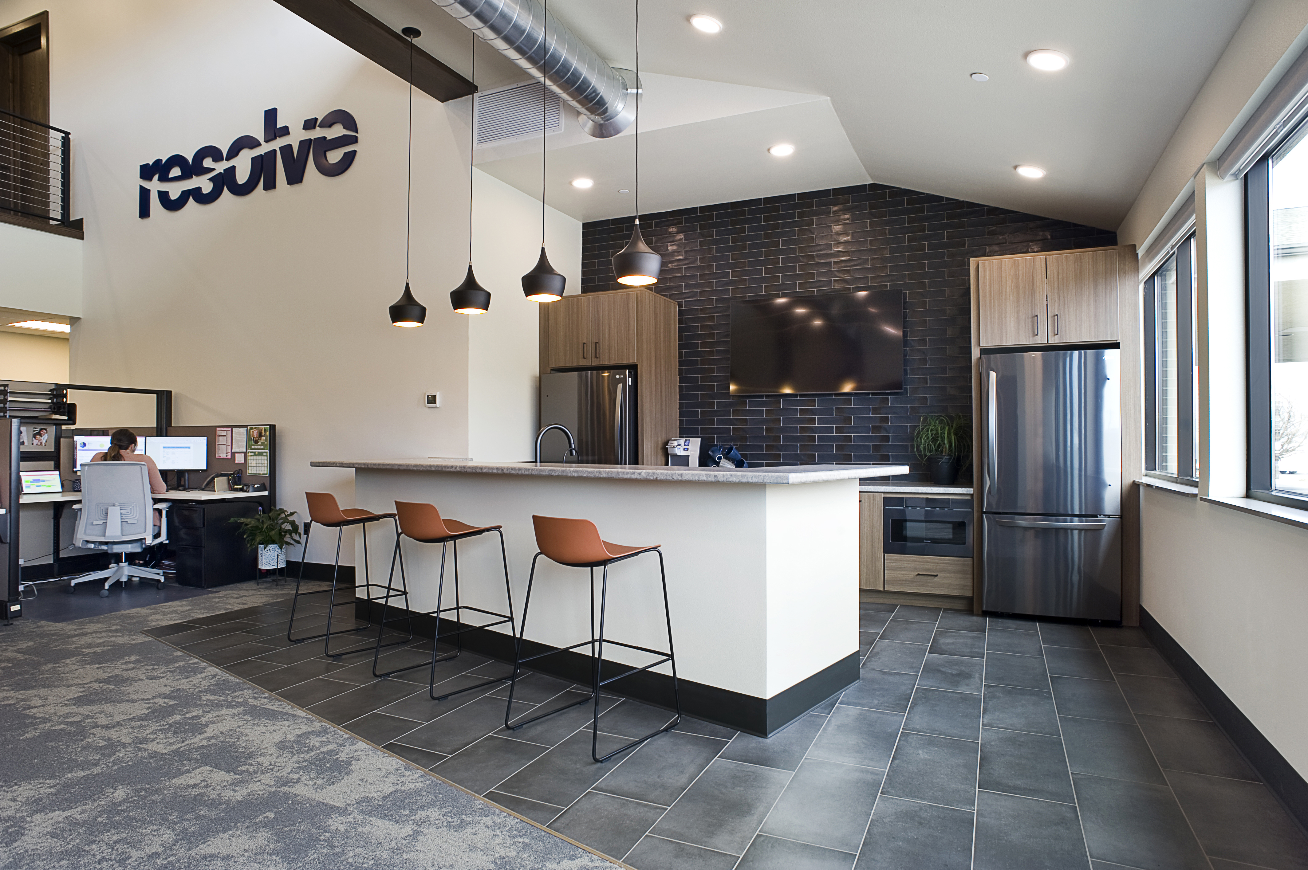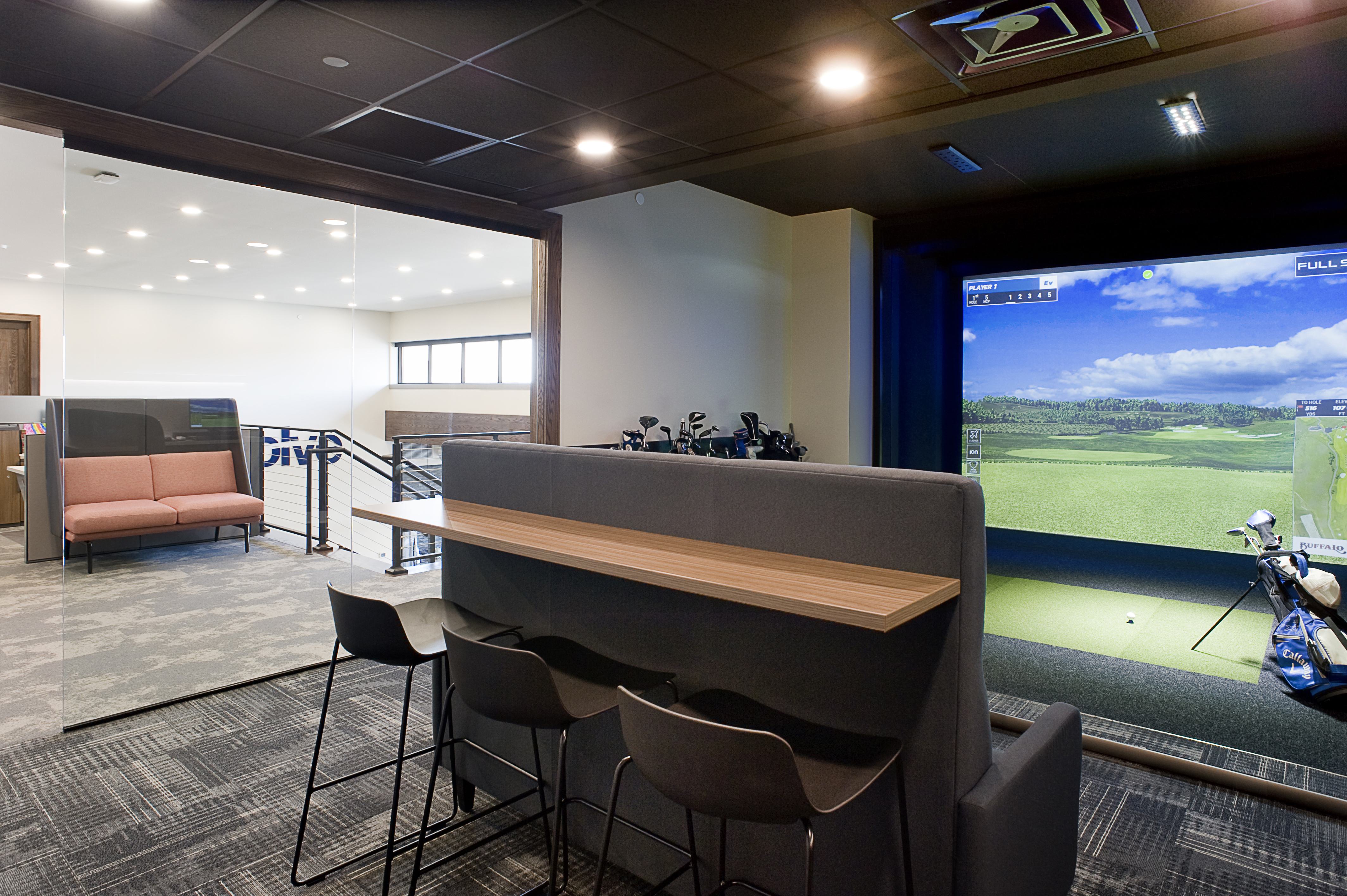 With careful planning, the mezzanine was safely integrated over an adjacent business while avoiding closures to operations throughout the duration of the project. The renovated space now includes offices, cubicles for temporary workstations, conference rooms, break area equipped for food preparation and storage, and even a golf simulator, enriching both client and employee experiences.